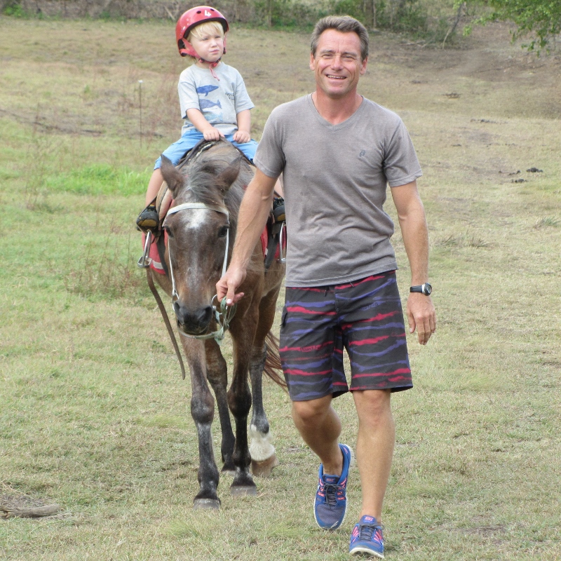Jack kümmert sich total aufmerksam um uns. Zwei Stuten (Gaya für Matilda und Tatjana für Joni) werden für uns geputzt und gesattelt. Obwohl Jack nur französisch spricht haben die Kinder sofort Vertrauen gefasst und gehen mit ihm in die Sattelkammer und suchen Helme aus. Das Anwesen ist riesig und total schön. Jeder mit einem Pferd an der Hand laufen wir den Hügel hoch und sehen einen Moment den großen Kindern zu, die sich auf einen Wettbewerb vorbereiten, bei dem einige Aufgaben auf dem Rücken der Pferde erledigt werden müssen.